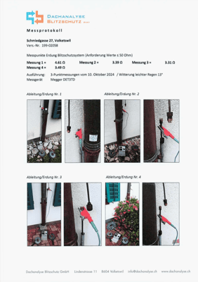 Bei der Kontrolle überprüfen wir die äusseren sichtbaren Teile des Blitzschutzsystems inkl. Erdungen, und messen die Erdwiderstandswerte. Daraus wird ein Gesamtprotokoll erstellt.